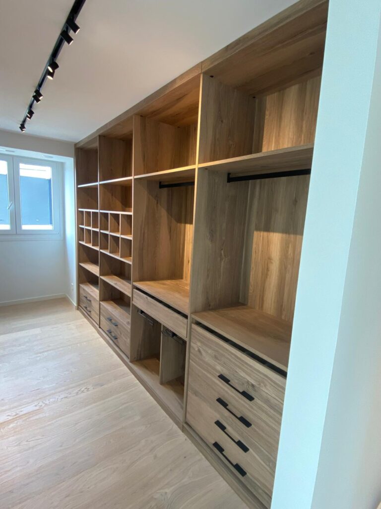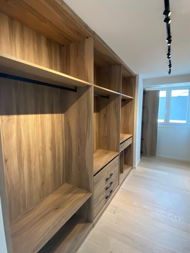 Vestidor en nogal. Accesorios, barras y tiradores en negro.