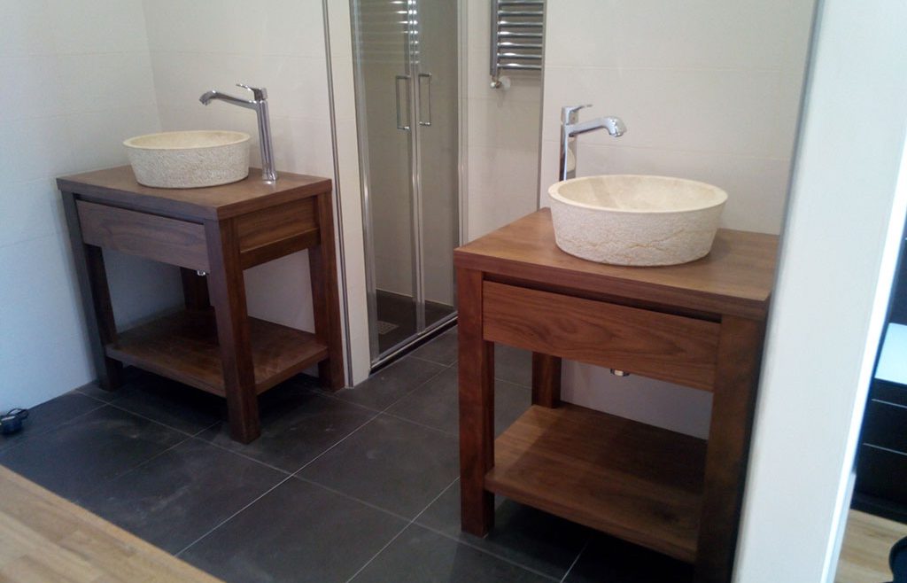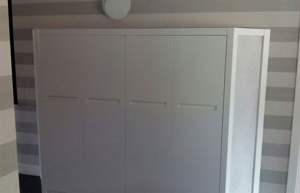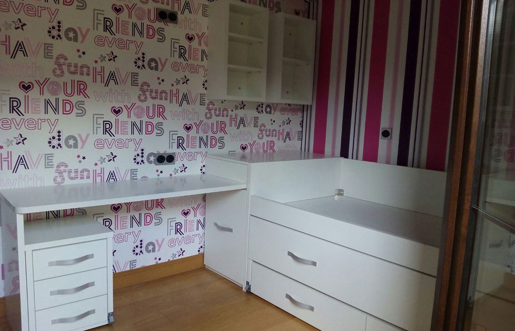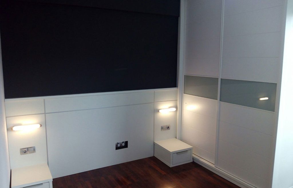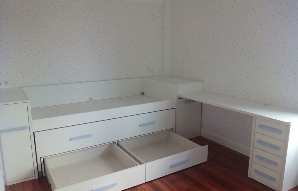 Podemos combinar infinidad de acabados para personalizar totalmente el dormitorio a fabricar. En este caso empanelamos la zona trasera de la mesa con paneles de diferentes acabados.