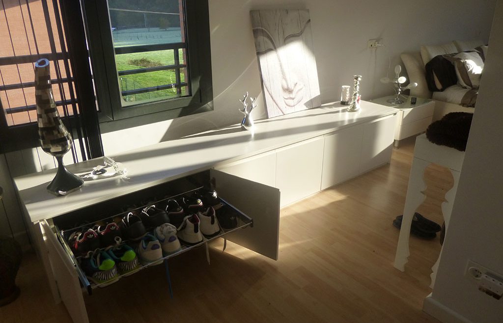 Una buena opción para el calzado. Este módulo bajo, en la zona de la ventana, está realizado totalmente a juego del armario de la habitación. Lacado en crudo con puertas lisas de uñero.
