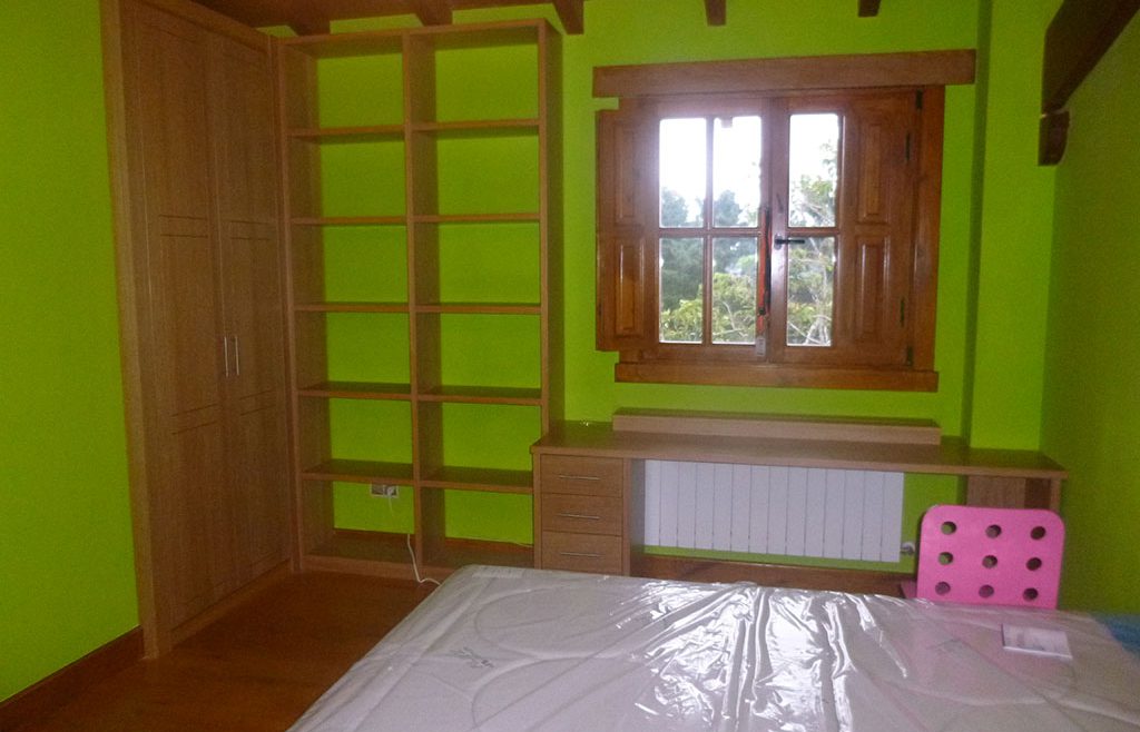 Al realizar todos nuestros mueble a medida las combinaciones son infinitas. Dormitorio en roble natural compuesto de armario modelo Vigo, librería sin trasera y mesa de estudio a juego.