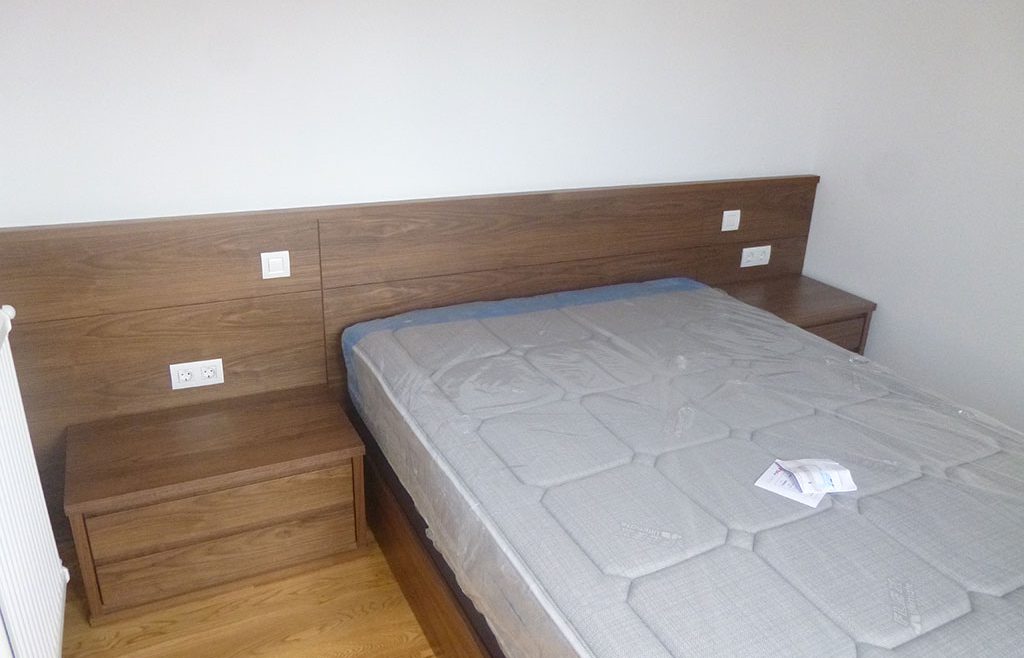 Dormitorio de matrimonio, cabecero y mesitas en nogal natural. Los paneles que forman el cabecero ajustan perfectamente en todas las paredes con las que limitan.