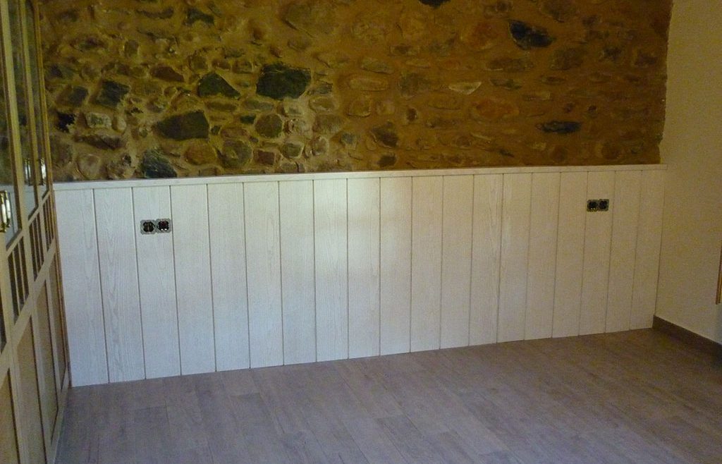 Ejemplo de friso en fresno lacado y patinado. Fabricado a medida y totalmente ajustado a la piedra.