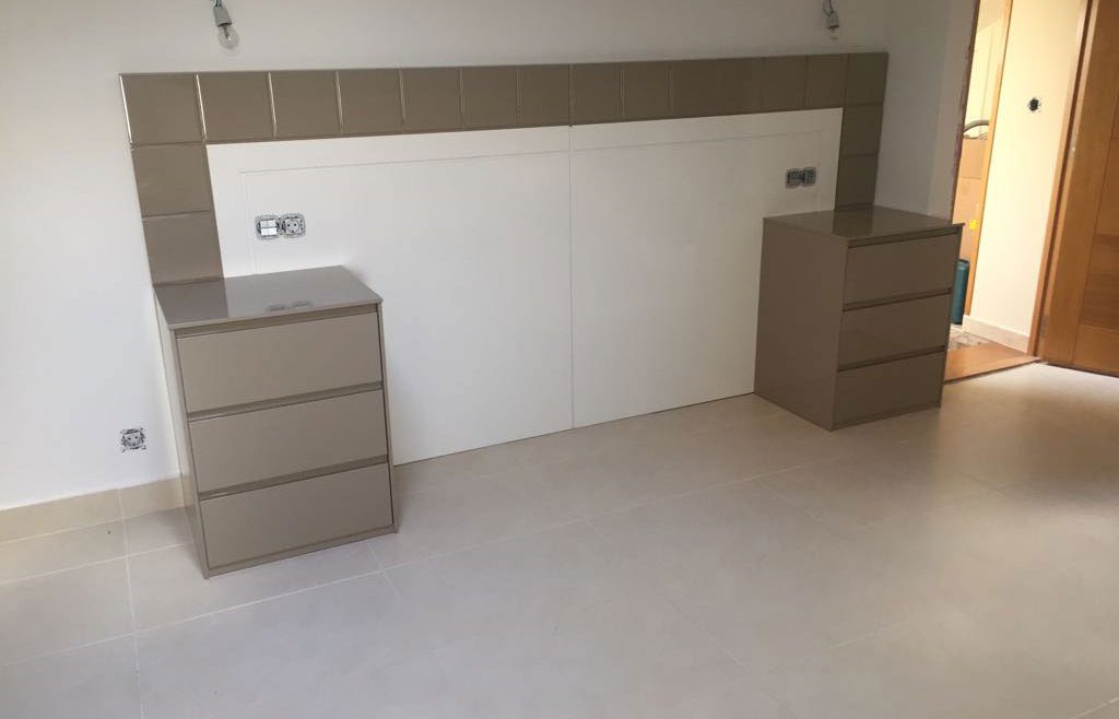diseño y medidas al gusto del cliente. Este cabecero y sus mesitas están terminadas en gris alto brillo a juego del armario.