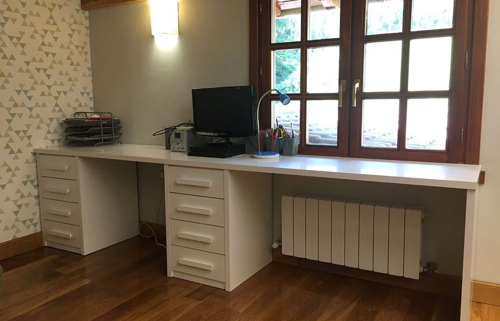 Mesa de estudio bajo ventana laminada en blanco, con cajones y dos zonas de trabajo.