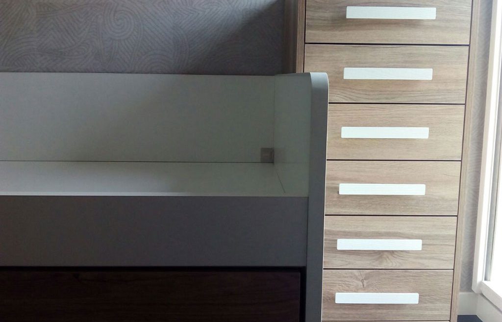 Cama nido compacta y sinfonier a juego fabricado en laminado de roble rústico y blanco liso.