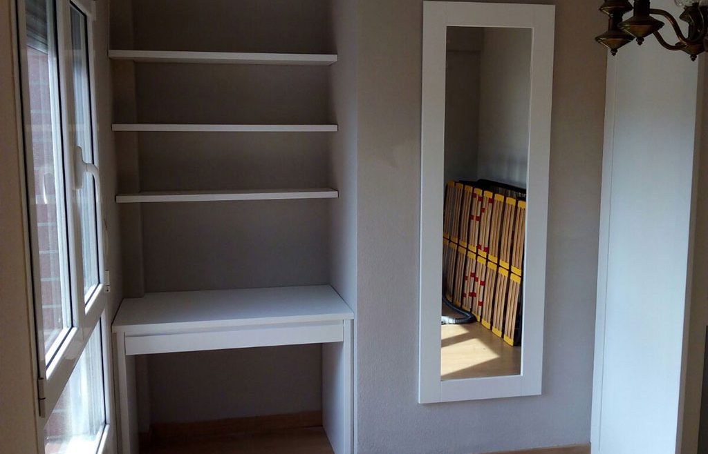 En un pequeño hueco de la habitación se ha fabricado a medida y a juego con el armario esta mesa de estudio, con estantes de pared y espejo, lacado todo ello en Ral 9003.