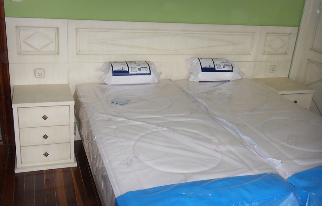 Cabecero y mesitas clásicas modelo Kandela, lacado en crudo y patinado. Para una mayor precisión en el acabado siempre recomendamos que la fabricación sea simultánea con el armario.