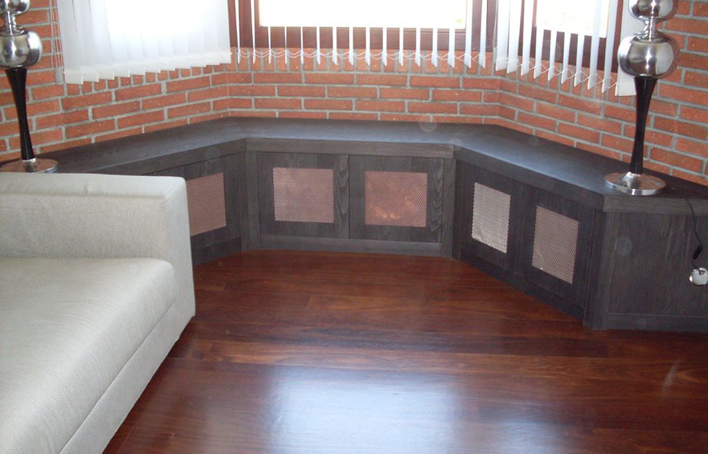Armario bajo ventana, ajustado totalmente a la morfología del edificio, sirviendo de zona de descanso o lectura. Acabado en fresno tono ceniza con celosía metálica y paneles oxidados.