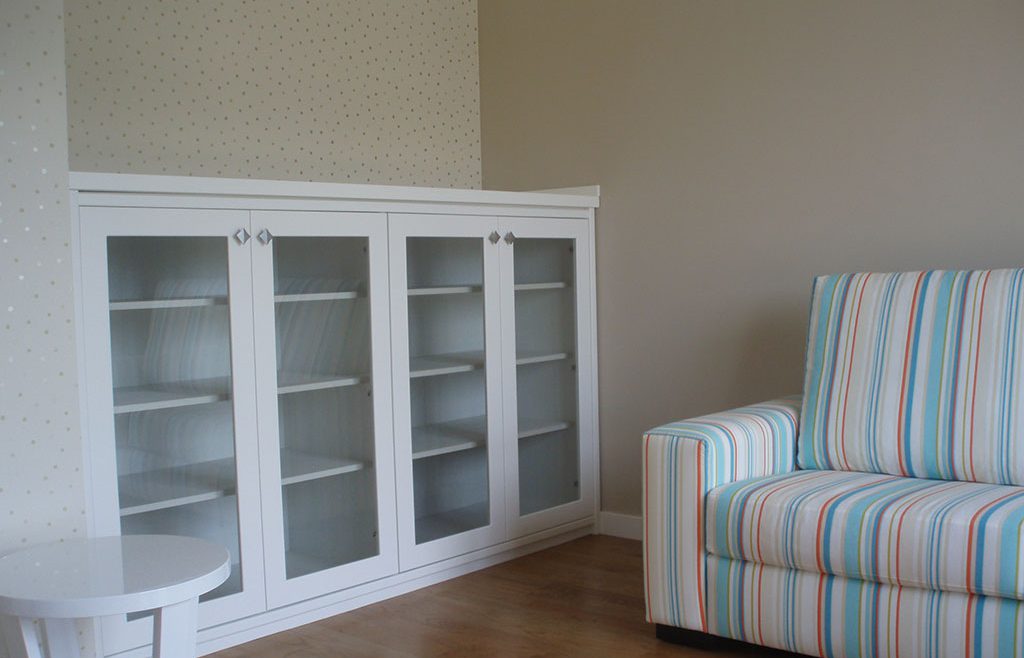 En el hueco preparado para el armario empotrado se hizo este aparador, dado que la estancia se dedicó a salita de estar. Puertas lavadas en blanco modelo Vigo y cristales transparentes.
