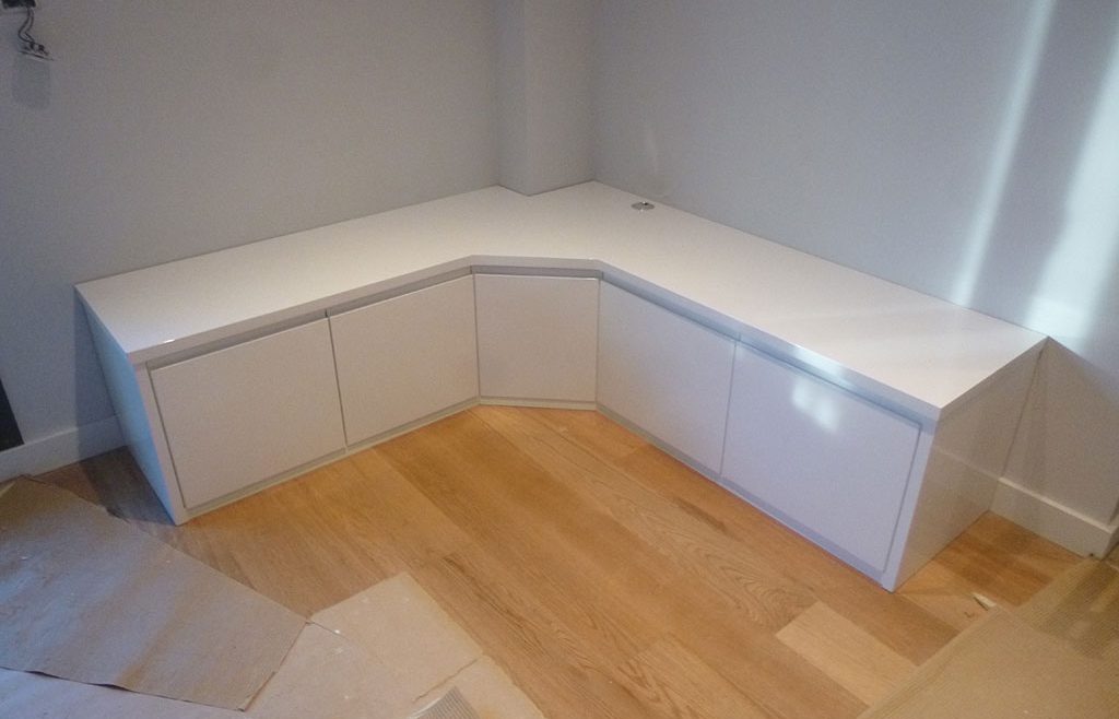 Pequeño módulo en rincón para TV. Acabado en alto brillo con puertas de uñero en horizontal.