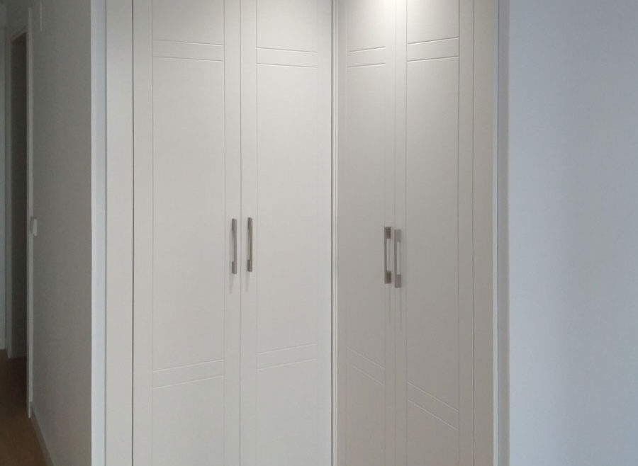 Armario en rincón, sistema de apertura mediante plegables, puertas ciegas modelo Vigo lacadas en blanco.