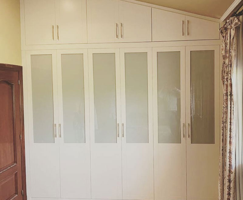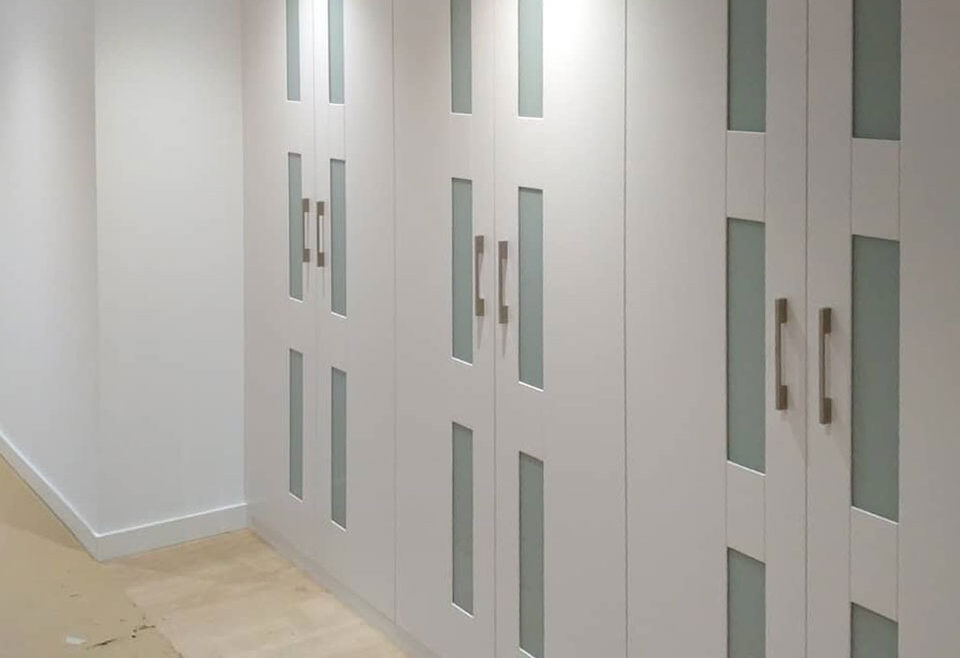 Armario compuesto de 6 puertas modelo Turín, lacado a juego de obra y cristales gris claro, detalle de plegable en modulo con grados.