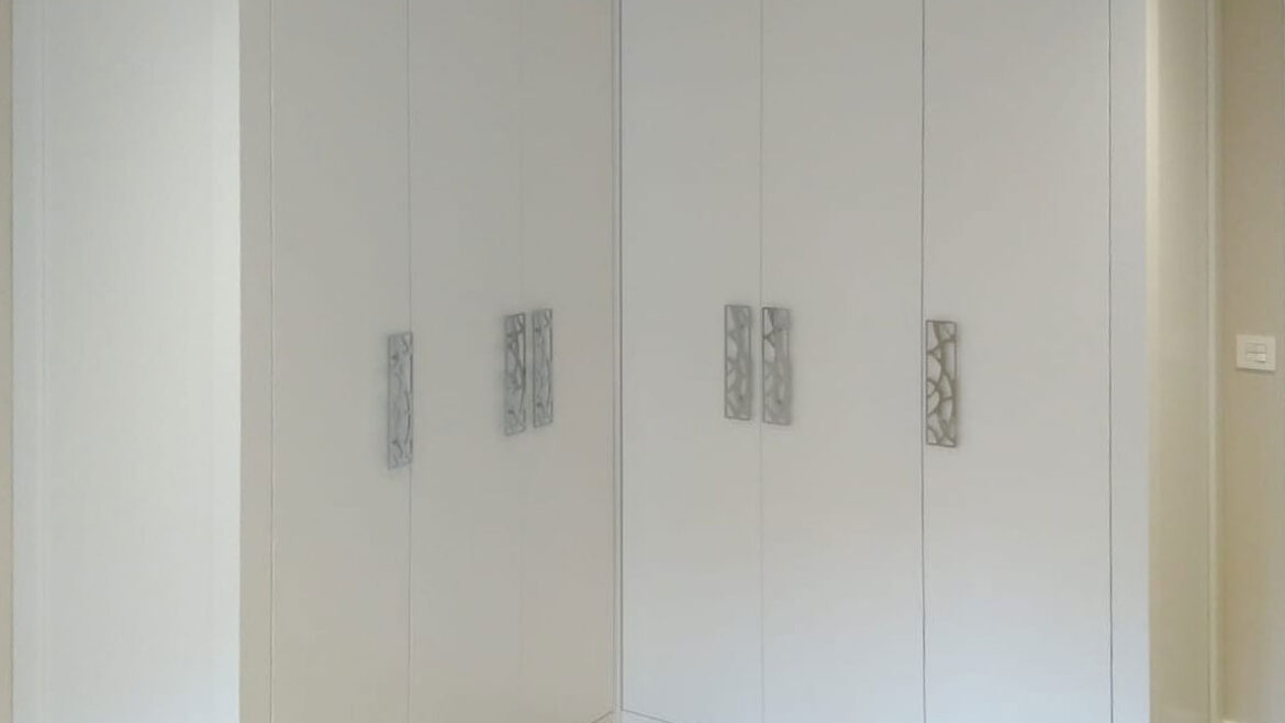 Armario en rincón, lacado a juego de la carpintería, puertas totalmente lisas con tirador plata modelo Aduriz, detalle de sistema plegable y cajeado trasero para viga.
