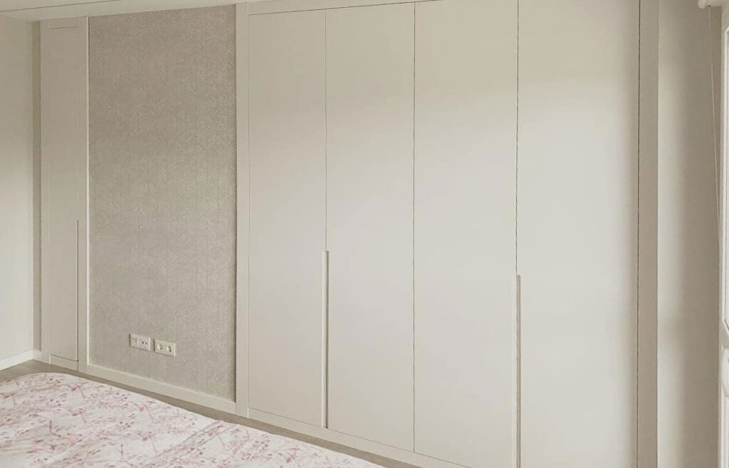 Armarios lacados a juego de la carpintería existente en la vivienda, puertas lisas con uñero hasta un metro de altura, la combinación con la textura del papel de la pared, es todo un acierto en la decoración de la estancia.