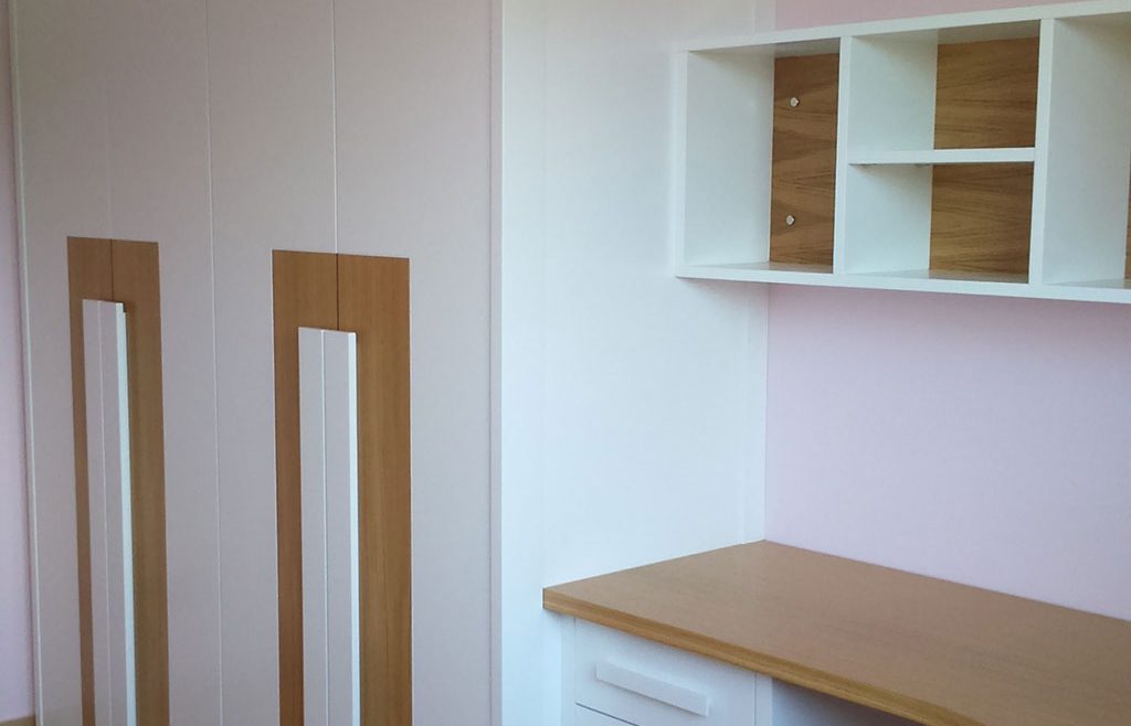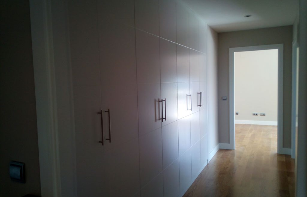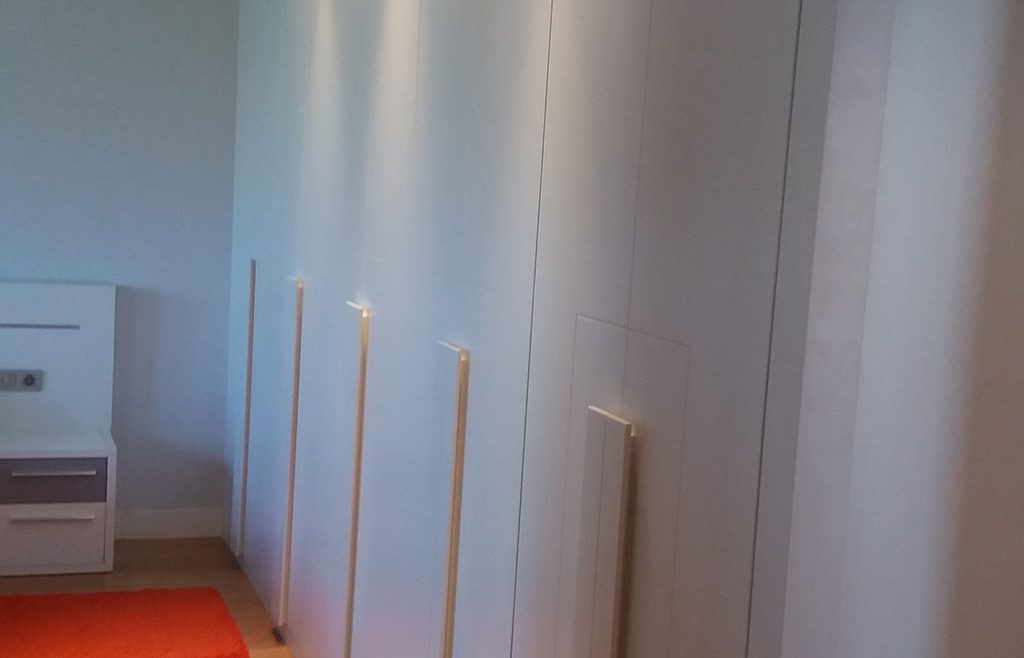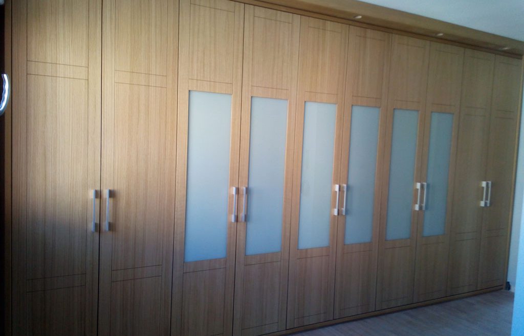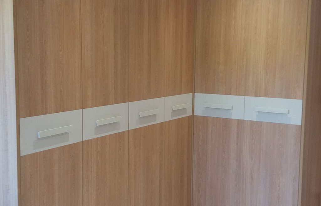 Infinidad de combinaciones tanto en laminados como en maderas o lacas son los que nos ofrece este modelo. Este armario en rincón se fabricó en laminado de roble acabado natural, franja melaminica, imitación a cuero blanco y tiradores en madera a juego.